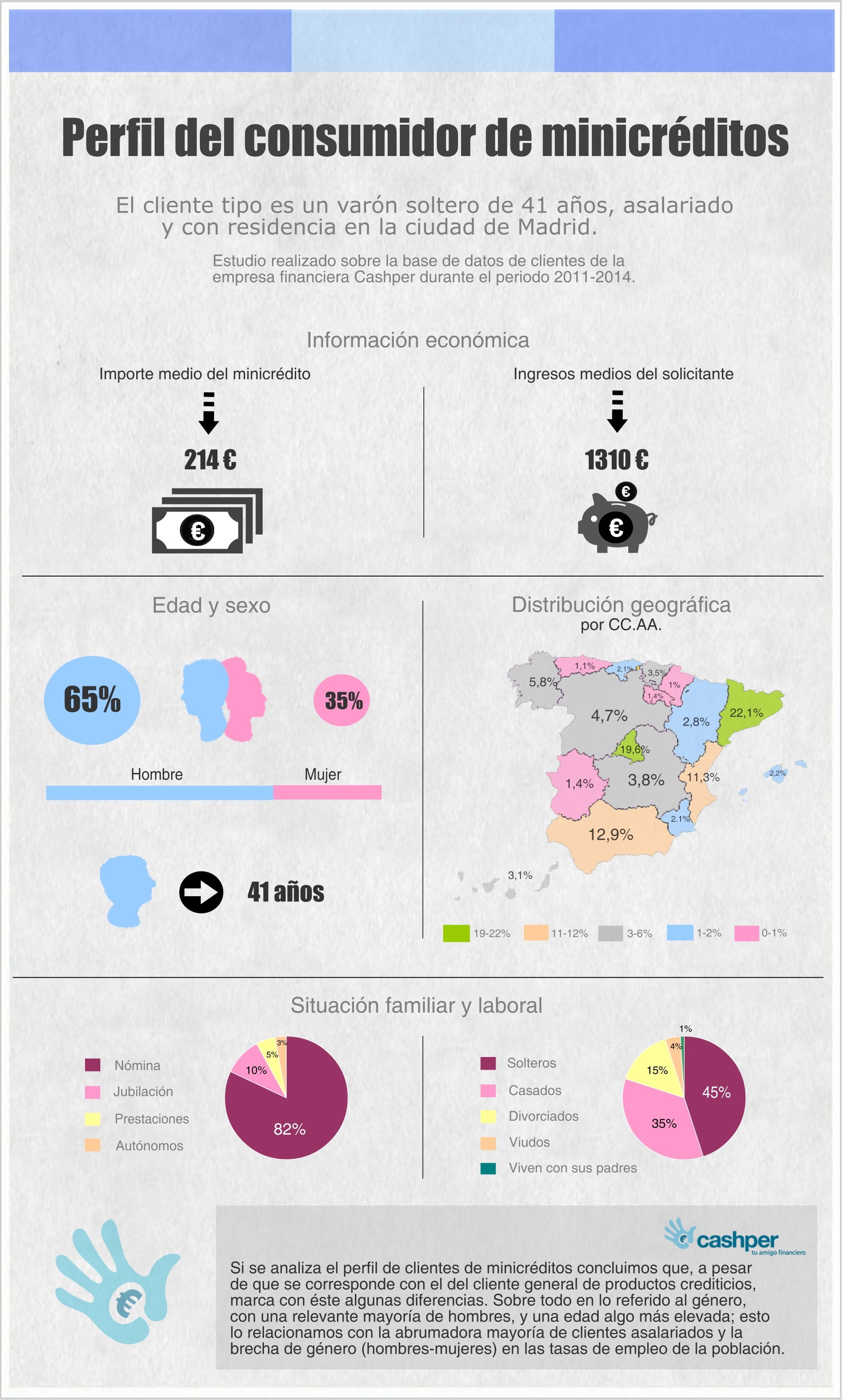 Este trabajo permite analizar las características personales y fiscales del consumidor medio de este especial producto crediticio: préstamos online de hasta 500 o 600 euros con un plazo de amortización que no supera el mes. Otra de sus principales características es la tramitación eminentemente online, que no suele demorarse más allá de unos minutos. El auge de estos créditos rápidos al calor de la escasez de liquidez (desde que arrancó la crisis, la financiación a familias y empresas cedió un 32,3% y un 12,7%, respectivamente, atendiendo a los cálculos realizados a partir de los datos publicados por el Banco de España) y la generalización de internet como medio de consumo masivo, también de servicios financieros, permite realizar un muestreo bastante fiable del perfil de cliente que los solicita.